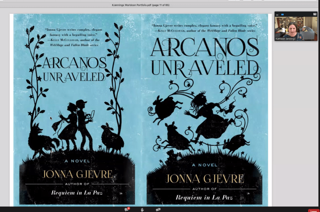 I went next to a webinar where Kathleen Jennings showed us a whole lot of her art and some of her process. She makes this really incredibly intricate paper cut art. Some of it is for book covers like these. These are paper cutouts. She held some of them up in her hands – they’re incredibly tiny and delicate. That was really neat to see.