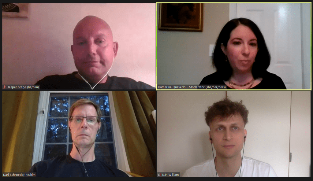 Then I went to a panel on Future Economics with Katherine Quevedo, Jesper Stage, Karl Schroeder, and Eli K.P. William. “Will we ever fully disentangle from the physical? Blockchains, crytocurrency, differently organic sentinence. Will economic concepts of supply, demand, money, resources hold up? Evolve? Or be completely different? And what might they look like?”