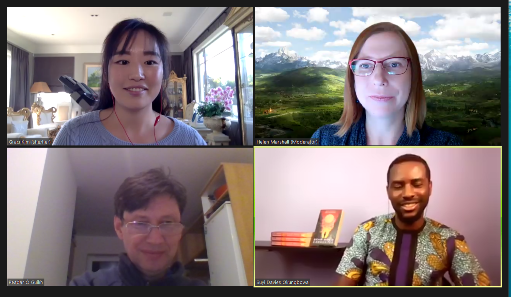 Next up was a panel on Shared Common Myths with Graci Kim, Helen Marshall, Peadar Ó Guilín, and Suyi Davies Okungbowa. “How do myths and legends impact cultures around the world? Carl Jung and Joseph Campbell argued that the same stories underlie myths everywhere. Were they right, or are there fundamental differences between myths from around the world?”