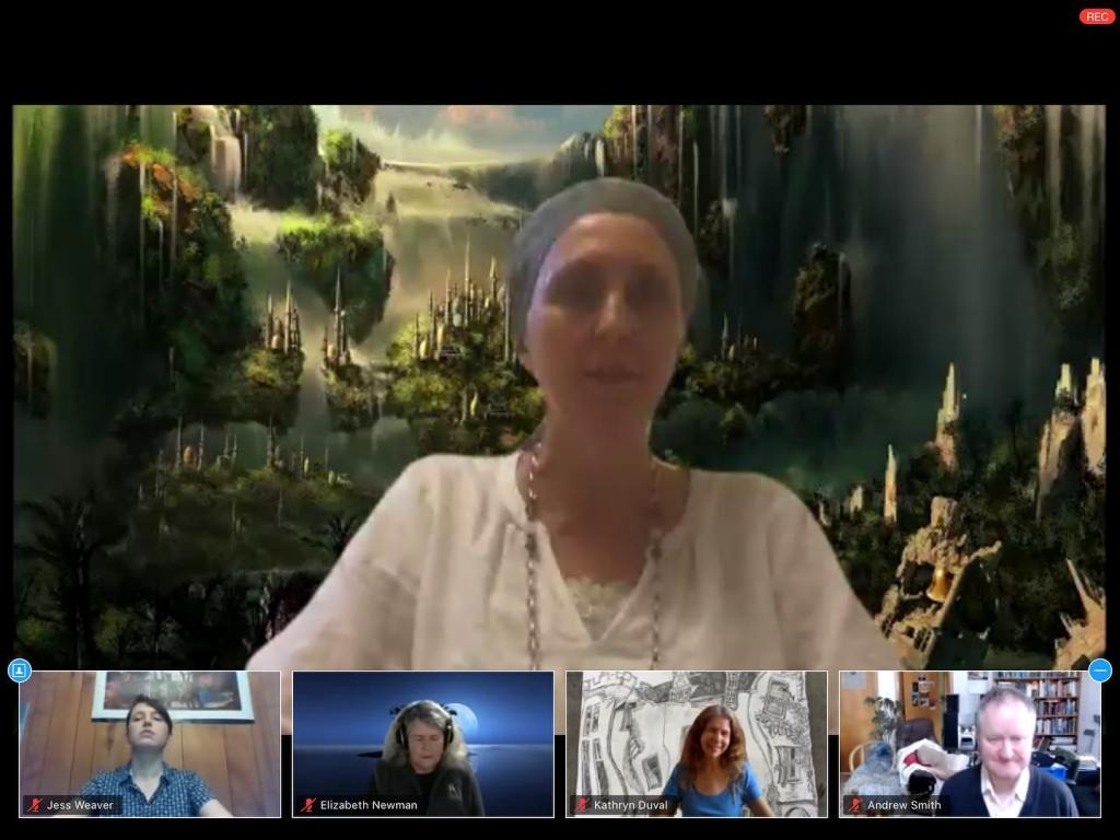 Started today off with another meditation/yoga session with Erin Wilcox. Just what was needed. One of the really weird things about a virtual convention is the sitting in one spot without moving for long periods of time. There’s usually loads of moving around during an in-person convention – between rooms, between buildings, walking the large exhibit hall, finding food and drink and restrooms. These sessions are a great start to the day, and I can watch the conflicting panels later on replay.